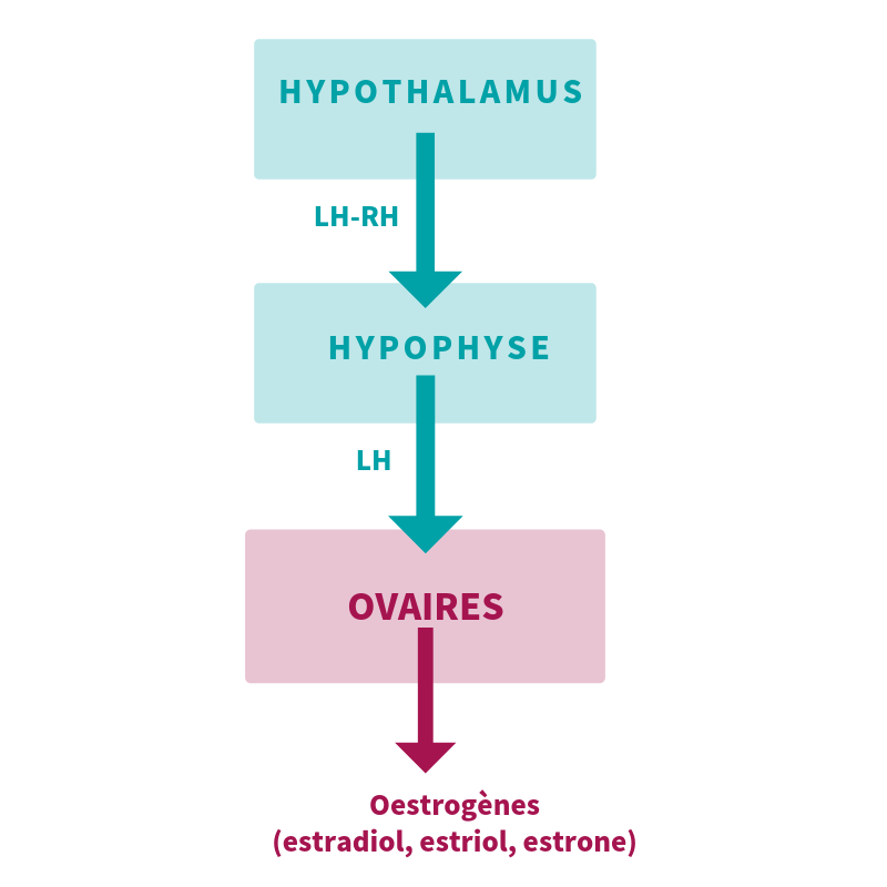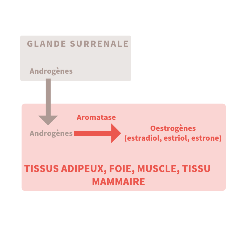 Les œstrogènes sont majoritairement produits par les ovaires. À la ménopause, les ovaires sont au repos et les œstrogènes sont produits par des organes périphériques grâce à des enzymes, les aromatases, qui vont transformer les androgènes produits par les glandes surrénales.