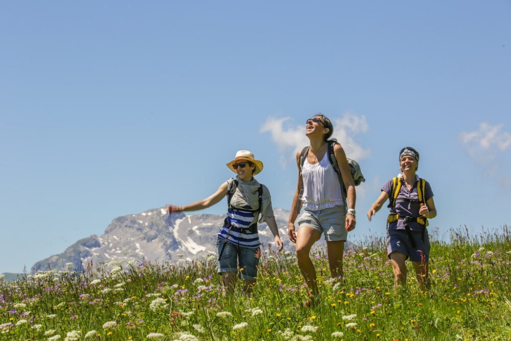 Petit matin au col de la Croix-Fry. L’été a déposé sur la vallée des Aravis un tapis vert tendre piqué de fleurs sauvages que festonne le noir des sapins. Sur la terrasse de l’hôtel de la Croix-Fry, vigie de bois tournée vers la montagne, on se laisserait volontiers bercer par le spectacle, la douceur de l’air, le délectable petit déjeuner (miel de montagne, confiture maison, jus frais), si Isabelle Loubet-Guelpa, qui veille aux destinées du lieu, ne nous attendait pas déjà, godillots enfilés et bâton de marcheur en main pour une incursion dans « sa » montagne.