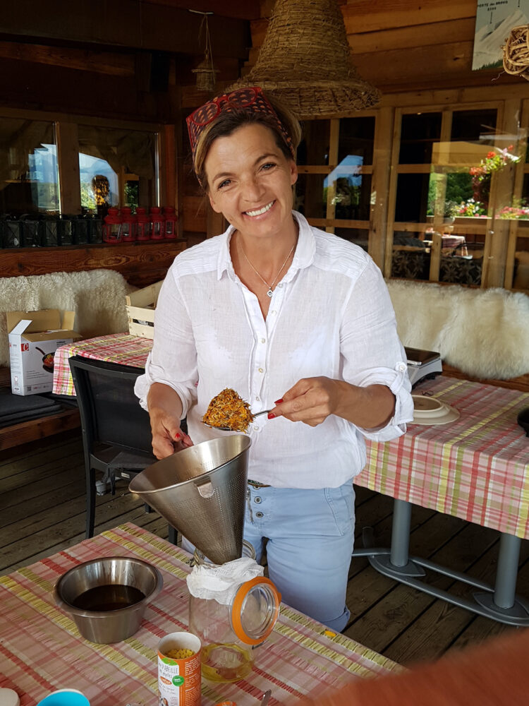 La matinée s’achève avec un déjeuner sur la terrasse de l’hôtel, où une salade mêlée aux herbes fraîches de la montagne nous est servie, apportant sa fraîcheur à une savoureuse tourte au reblochon. Ensuite, difficile de choisir entre le soufflé glacé au génépi et le parfait aux myrtilles… Mais, déjà, Isabelle nous entraîne dans le salon et installe sur une ancienne table de ferme un réchaud et de mystérieuses fioles. Elle m’interroge sur mes besoins. Sportive et sujette aux plaies et aux bosses, je lui dis qu’un remède naturel contre les blessures qui marquent la peau me serait bien utile. Nous partons donc sur un baume à l’Immortelle. Isabelle détaille : « Je prépare moi-même mes macéras huileux d’hélichryse : il faut cueillir les sommités des fleurs et avoir une bonne huile végétale bio. Je mets les pétales à macérer dans un bocal de verre ouvert couvert d’un linge, que je laisse dans une pièce bien aérée durant vingt-huit jours. Ensuite, je filtre cette huile, que je verse dans des bouteilles opaques. » Isabelle m’aide à fabriquer mon baume : au bain-marie, elle mélange de la cire d’abeille bio avec 100 ml de macéra à l’Immortelle. Le parfum de la fleur envahit vite le chalet. À l’heure du goûter, me voilà dotée d’un baume qui fleure bon la montagne, mais aussi de mille explications et conseils d’utilisation : ce n’est pas le moindre talent d’Isabelle que de se mettre au niveau des visiteurs (dans mon cas, en dessous de zéro !) pour expliquer à la fois les bienfaits des plantes et leur utilité. Dans la soirée, après une séance de méditation depuis le balcon de ma chambre, avec vue imprenable sur les Aravis, nous nous retrouverons pour réaliser des tisanes « sur mesure ». Un bol d’air pur.