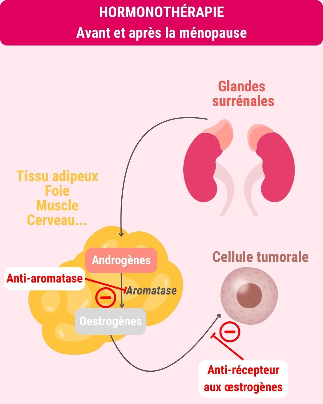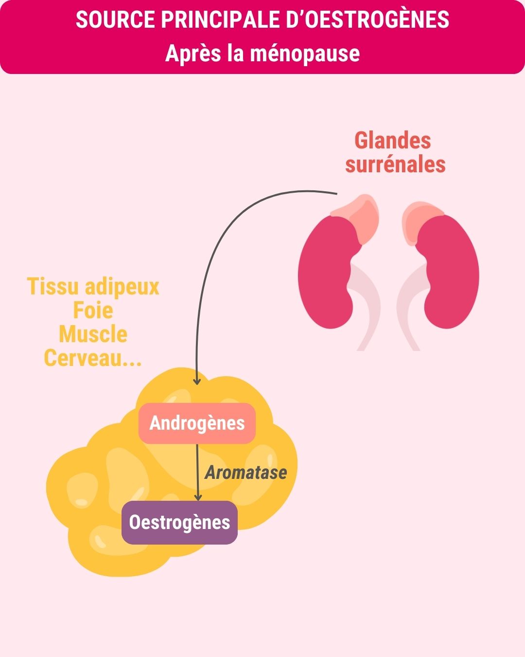 Après la ménopause, les œstrogènes proviennent principalement de la transformation des androgènes, produits par les glandes surrénales, sous l’action d’un enzyme : l’aromatase. Cette transformation a lieu dans les ovaires, le tissu adipeux, le foie, les muscle, le cerveau et le tissu mammaire.
