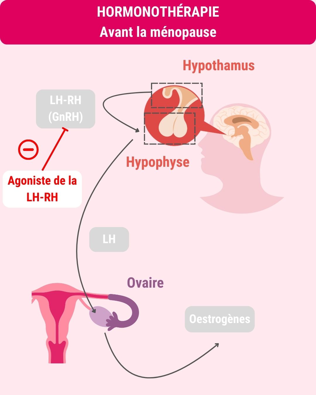 Il en va de même pour les femmes non ménopausées avant les traitements. Comme leurs ovaires produisent toujours des oestrogènes, on leur prescrira en plus des analogues de la LH-RH.