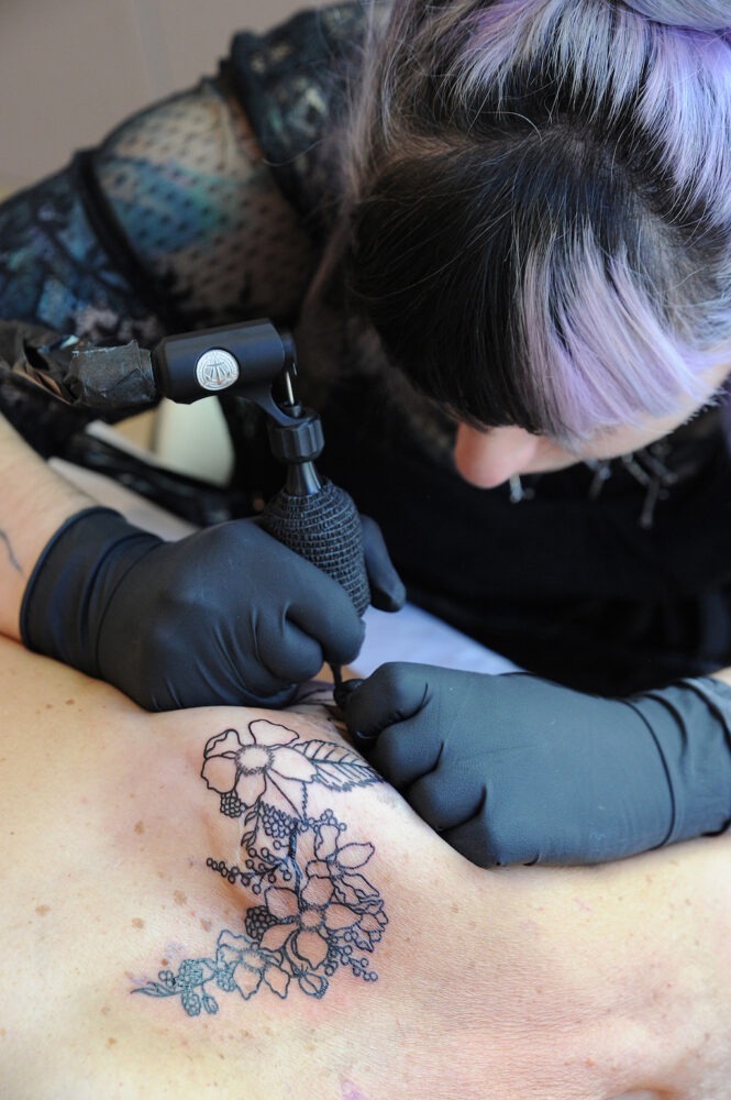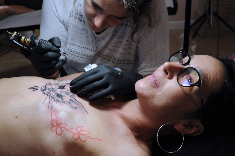 Pour les tatoueuses, l’aventure représente un défi. Amandine, alias Madness_Art, participe à l’opération depuis 2017. « La première fois, j’avais un peu peur parce que j’ignorais tout des cicatrices sur le sein. Heureusement, on a été formées par les médecins et oncologues de l’institut Bergonié, et j’ai été heureuse de tatouer ma première ancienne malade. Cette année, j’en ai tatoué deux. On communique via les réseaux sociaux. Elles expriment leurs souhaits, je leur dis si c’est possible et, ensemble, nous définissons un motif, un dessin. Cette expérience donne du sens à mon travail habituellement plus fashion et les rencontres à la Maison Rose sont un vrai condensé d’énergie et d’optimisme. » Même enthousiasme pour Odré : « J’ai perdu ma meilleure amie d’un cancer du sein, alors participer à Rose Tattoo, c’était pour moi une évidence. Je viens de réaliser un Bouddha, un arbre de vie et un superbe crâne en noir et gris agrémenté de fleurs de couleurs. »