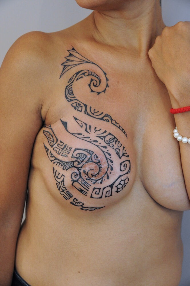 Pour Delphine, Vosgienne soignée à Bordeaux où elle a de la famille, le choix s’est porté sur une tête de chat, placée au centre de son buste plat. Après une double mastectomie, elle a fait enlever ses prothèses en mousse qu’elle ne supportait plus et se trouve aujourd’hui « très bien sans seins ». Mais mieux encore depuis le tatouage de Laurette. « Mon chat, Grisouille, m’a particulièrement aidée durant ma maladie. Le dessin lui ressemble vraiment ! »